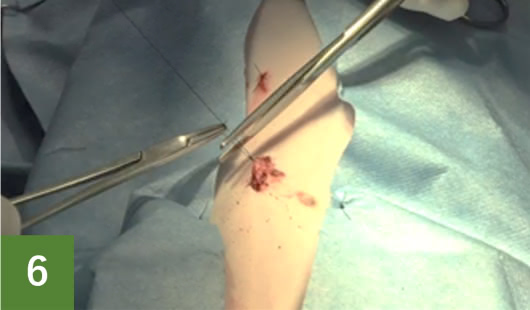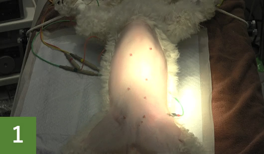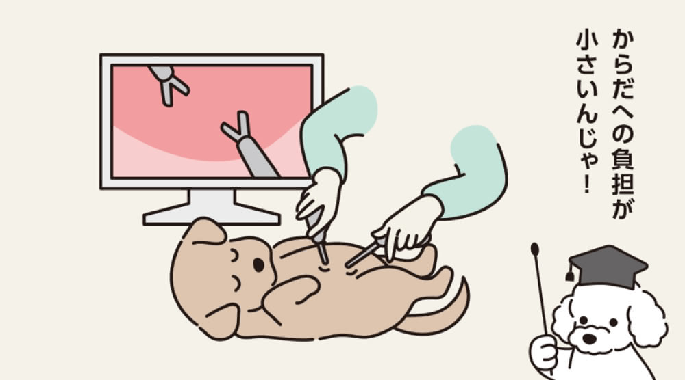 通常の開腹手術では、傷口を小さくしようとすると卵巣と子宮を強く引っ張ることになり負担がかかります。腹腔鏡では小型犬や猫で3-5mm、大型犬で5-10mmの小さな傷穴で卵巣、子宮の処理を行うことができます。